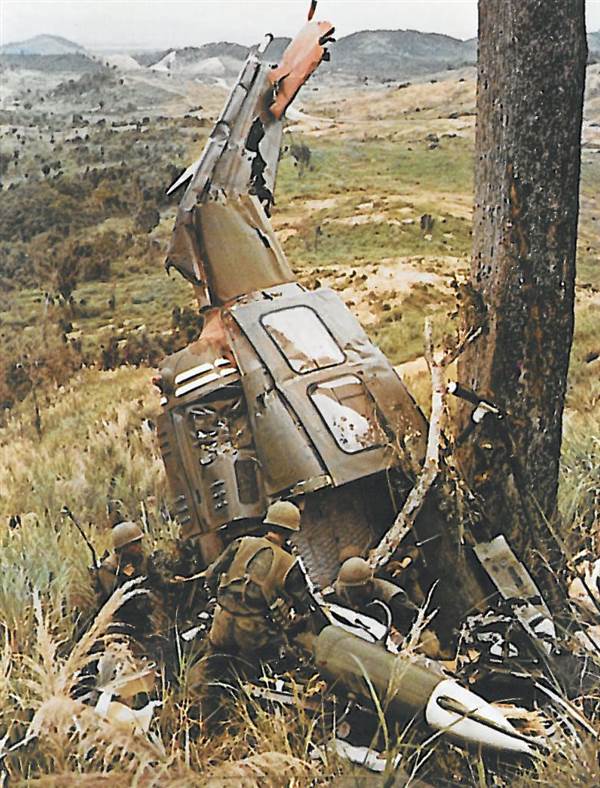 T/R hit ground, spun and crashed nose first while resupplying a beseiged Korean fire base at An Khe Pass. |