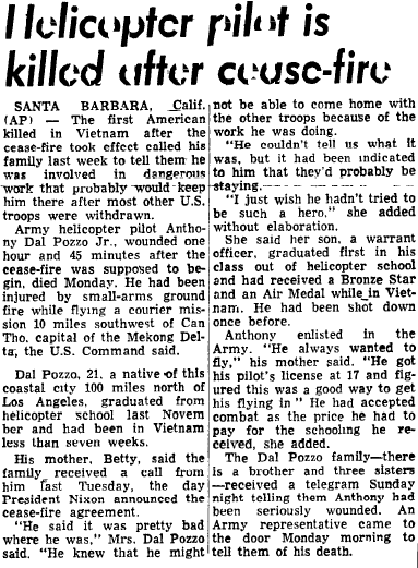 A/C was a marked JMC and was returning from one of the first missions flown following the offical Cease-Fire to Can Tho when a single VC fired at the A/C hitting the pilot. Pilot died one day later from injuries. |