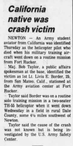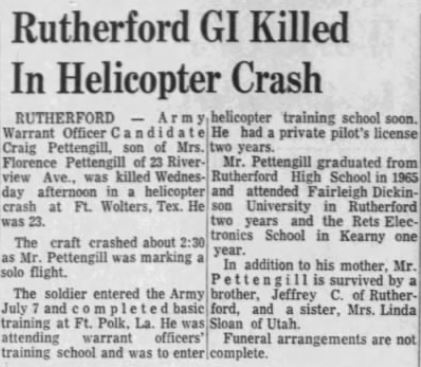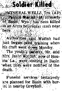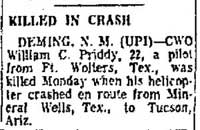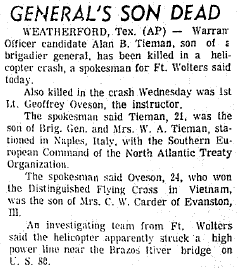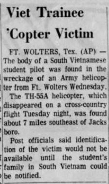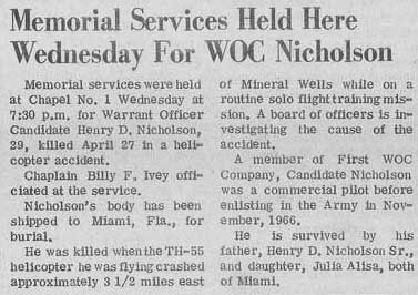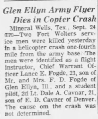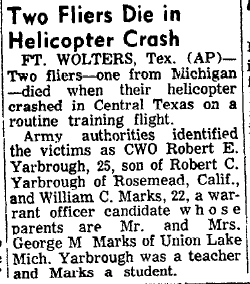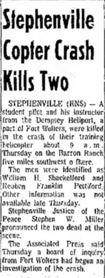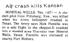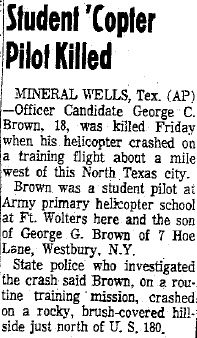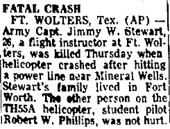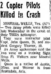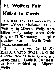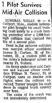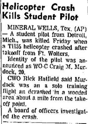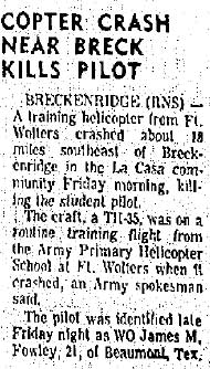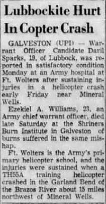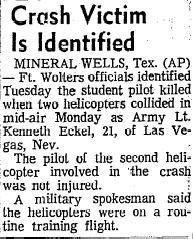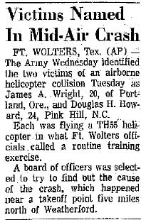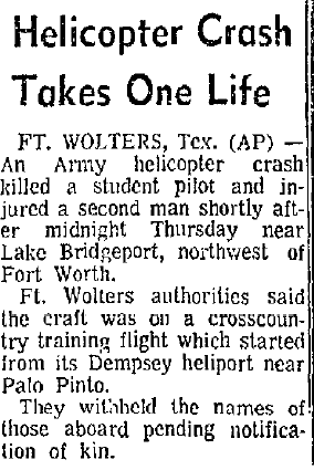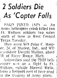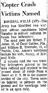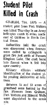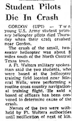 Mid-air crash with OH-13 near the Holiday Inn in Mineral Wells during training at Ft Wolters. |