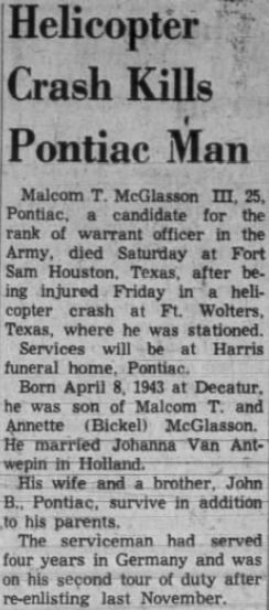 A/C crashed at Ft Wolters. Cause of crash: Electric clutch actuator malfunctioned at 100' 35 knots, engine failed, good autorotation, fuel tank ruptured on impact. CW2 Williams died 22JUN68 from injuries. |