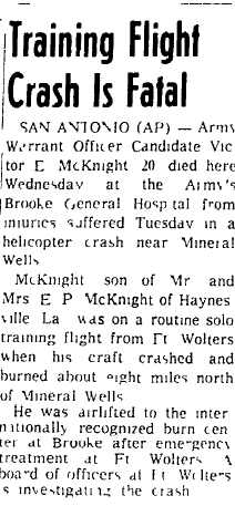 A/C crashed about 8 miles N of Mineral Wells while on a routine solo training flight from Ft Wolters. McKnight died 2 days later. |